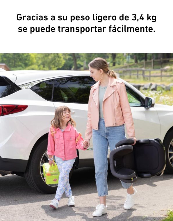 - Con un peso de solo 3.4 kg, es fácil de trasladar entre vehículos, lo que lo hace ideal para familias que necesitan cambiar el asiento entre diferentes coches.