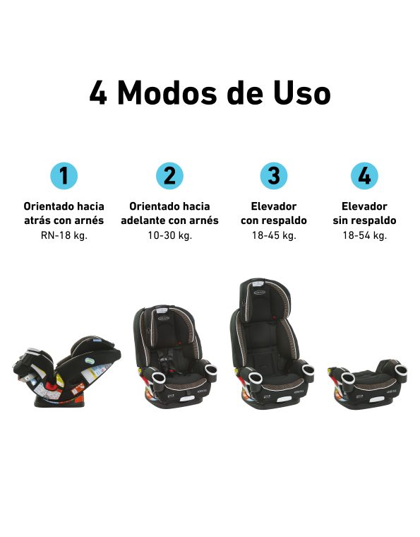 - Crece con el niño en 4 etapas: Etapa 1: orientado hacia atrás con arnés: RN a 18 kg. Etapa 2: hacia adelante con arnés: 10 a 29 kg. Etapa 3: elevador con respaldo: de 18 a 45 Kg. Etapa 4: elevador sin respaldo: de 18 a 54 kg.