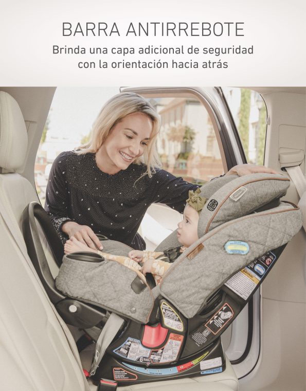 • La barra antirrebote orientada hacia atrás brinda una capa adicional de seguridad al limitar la rotación del asiento y de tu hijo en caso de impacto.