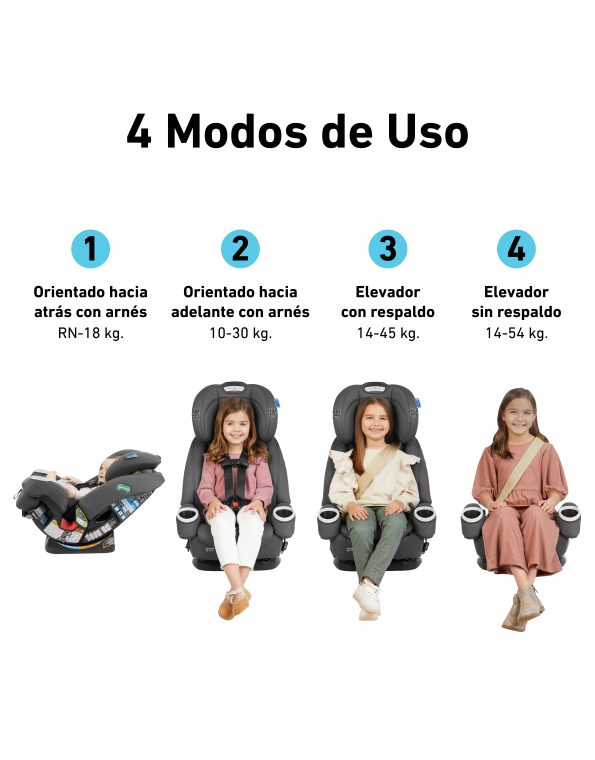 Asiento 4 en 1 que crece con tu hijo para que disfrutes de 10 años de uso. Además incluye un conjunto de sistemas y tecnologías innovadoras: Tecnología SnugLock®, Botón LATCH InRight™ y Simply Safe Adjust ™.