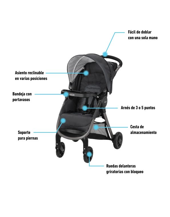 - Asiento reclinable de varias posiciones para la comodidad del bebé en todas sus exploraciones juntas