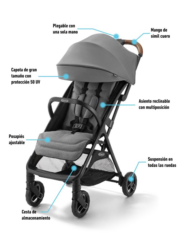 • El carrito incluye una canasta de almacenamiento de fácil acceso y suspensión en las 4 ruedas para un paseo suave.