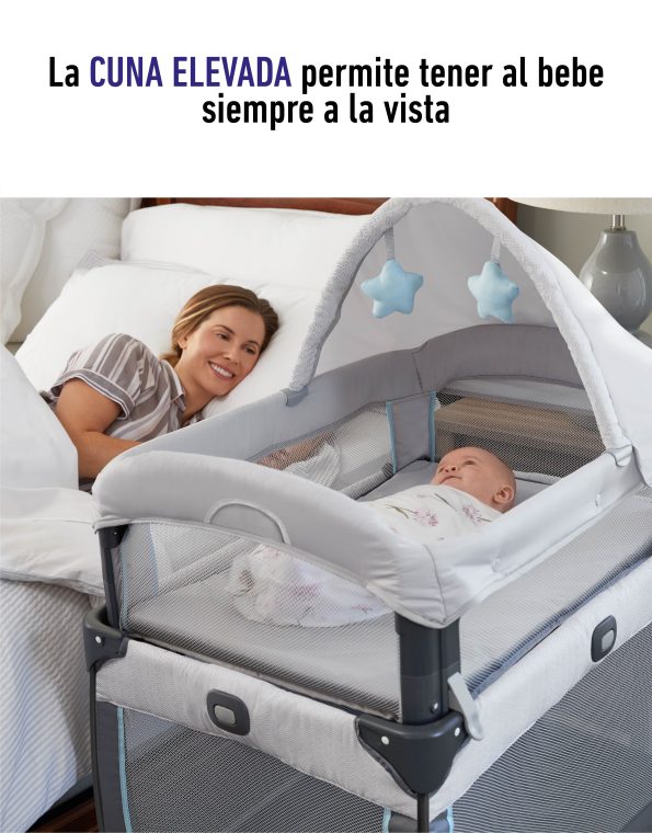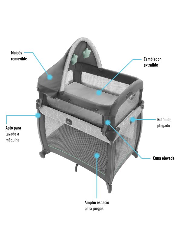 La cuna corralito colecho 4 en 1 Graco® My View ofrece cuatro formas diferentes de uso, además crece con el bebé y se pliega para viajar. Para los recién nacidos, un moisés elevado junto a la cama coloca perfectamente al bebé a la altura de los ojos para los controles nocturnos. Para los bebés, el moisés desciende hasta el nivel de la cuna y se puede quitar para en la cama o en el piso, en cualquier lugar de la casa.