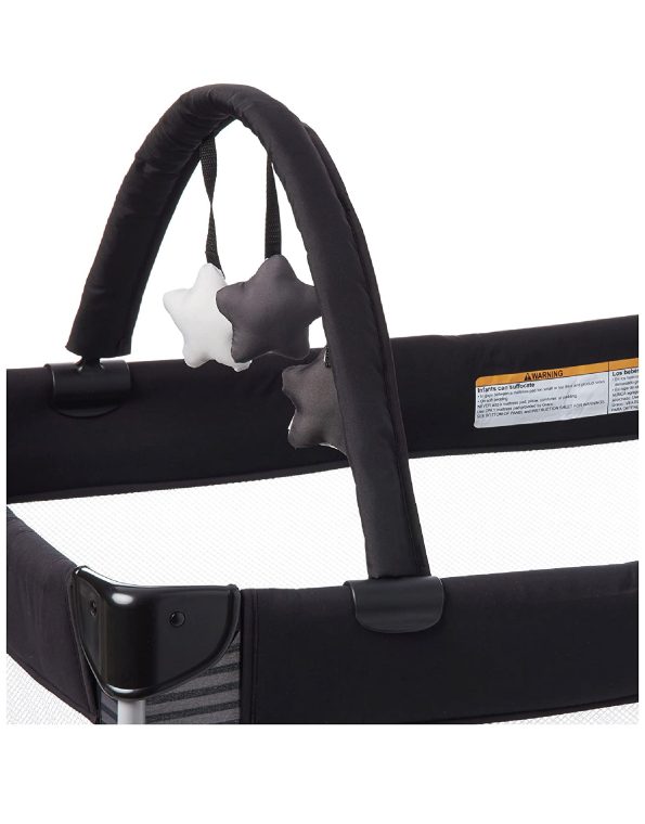 La capota integrada protege al bebé de la luz durante las siestas y viene con juguetes suaves removibles para el entretenimiento. También incluye una bolsa de transporte para llevarla cómodamente cuando se viaja.