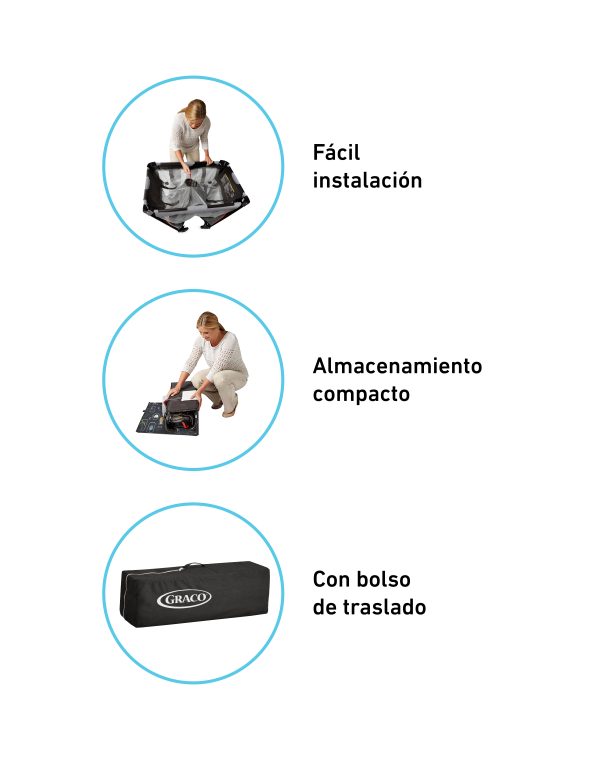 Gracias a sus ruedas y al sistema de plegado rápido exclusivo de Graco, podés moverlo y guardarlo sin esfuerzo. Además, viene con una bolsa de transporte para llevar a cualquier lugar.