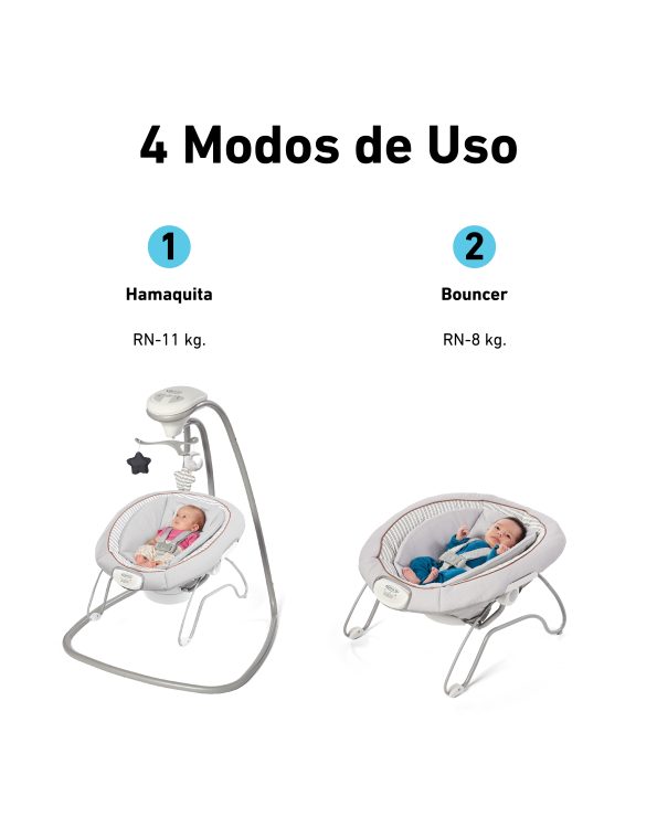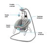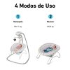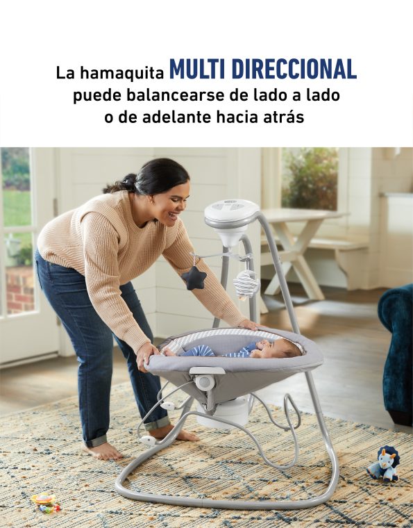 - La hamaquita cuenta con un suave movimiento de balanceo y un asiento de 3 posiciones para balancearse de lado a lado o de adelante hacia atrás.