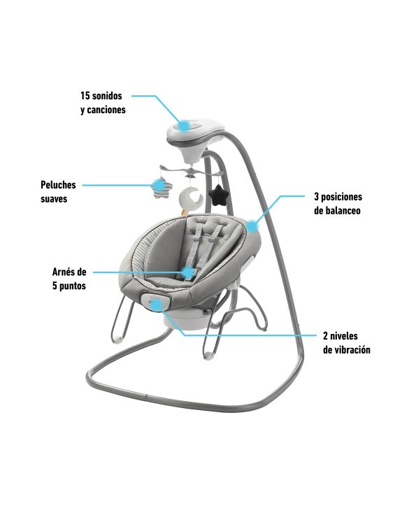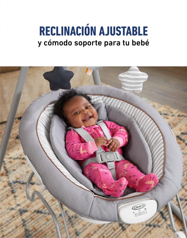 Ofrece diferentes tipos de movimiento que imitan la forma natural en que los papás calman a sus bebés: puede mecer de lado a lado, adelante y atrás, en forma de cuna o con un suave deslizamiento. Incluye un soporte corporal acolchado con telas de algodón orgánico, 3 posiciones de reclinado arco de juegos con muñequitos suaves y arnés de 5 puntos acolchado.