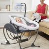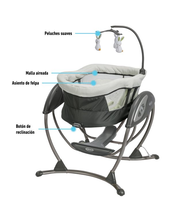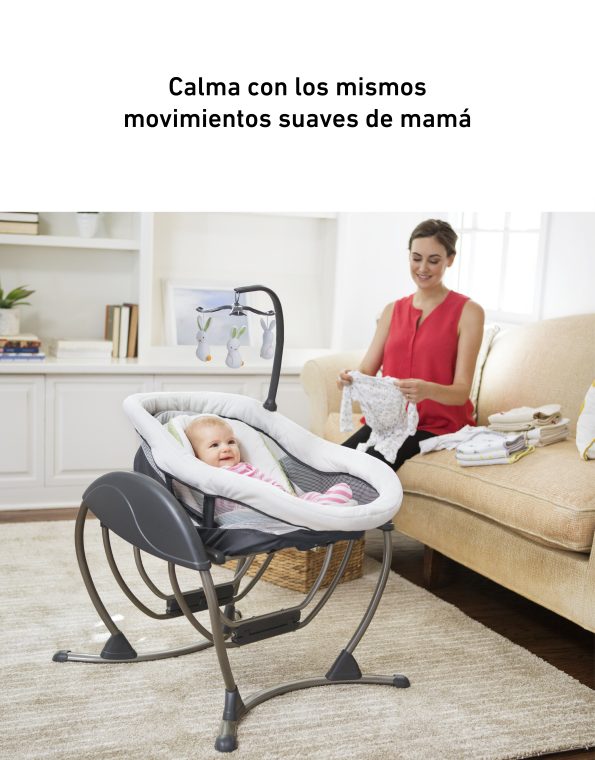 Ofrece diferentes tipos de movimiento que imitan la forma natural en que los papás calman a sus bebés: puede mecer de lado a lado, adelante y atrás, en forma de cuna o con un suave deslizamiento. Incluye un soporte corporal acolchado con telas de algodón orgánico, 3 posiciones de reclinado arco de juegos con muñequitos suaves y arnés de 5 puntos acolchado.