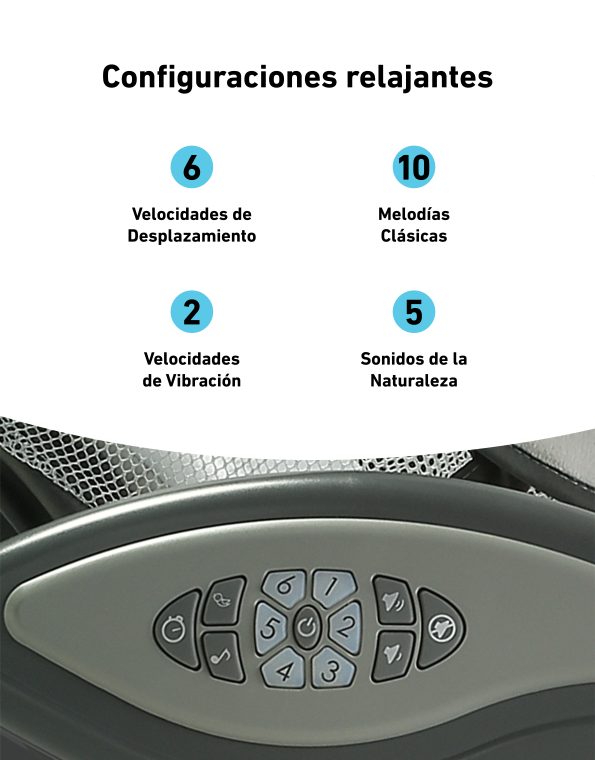 - El DuoGlider utiliza el mismo movimiento suave como si fuera que los estes meciendo con tus propias manos, también cuenta con vibración de dos velocidades, seis velocidades de oscilación, melodías clásicas y sonidos de la naturaleza, entre otros, para mantener al bebé calmado y cómodo.