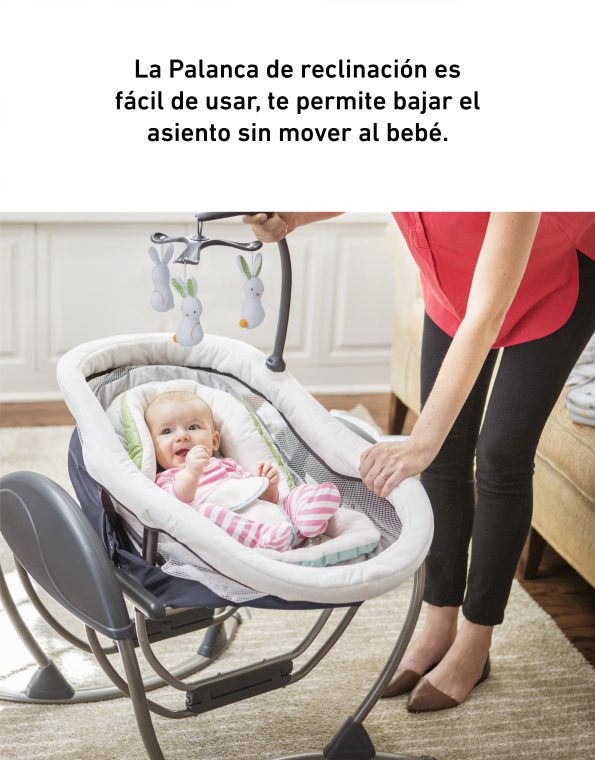 - Baja suavemente el asiento de la hamaquita para crear un moises cómodo, brindando a tu bebé un lugar seguro y cómodo para descansar sin tener que moverlo de la hamaquita.