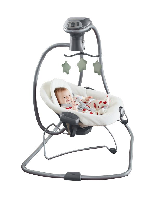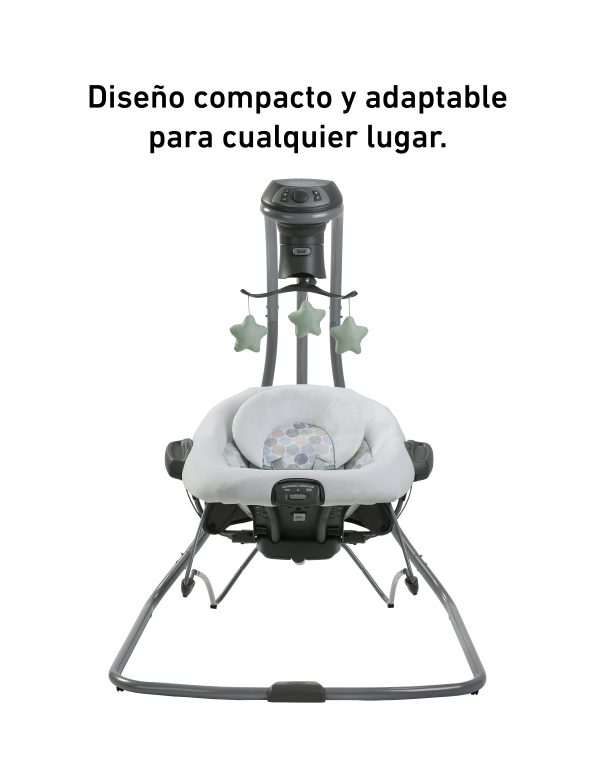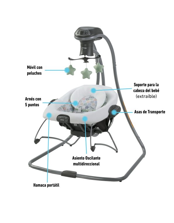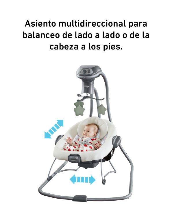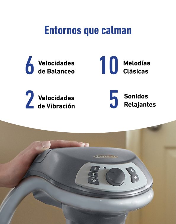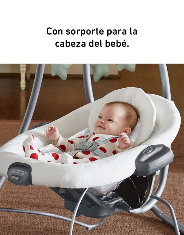 Ofrece diferentes tipos de movimiento que imitan la forma natural en que los papás calman a sus bebés: puede mecer de lado a lado, adelante y atrás, en forma de cuna o con un suave deslizamiento. Incluye un soporte corporal acolchado con telas de algodón orgánico, 3 posiciones de reclinado arco de juegos con muñequitos suaves y arnés de 5 puntos acolchado.