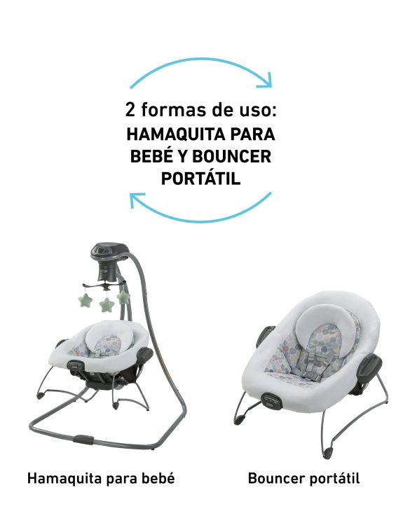 La hamaquita Soothe My Way™ para bebé con balancín extraíble cuenta con 8 movimientos relajantes en 2 direcciones, para 16 formas de calmar al bebé. El asiento 2 en 1 de la hamaquita se puede utilizar como bouncer en toda la casa.