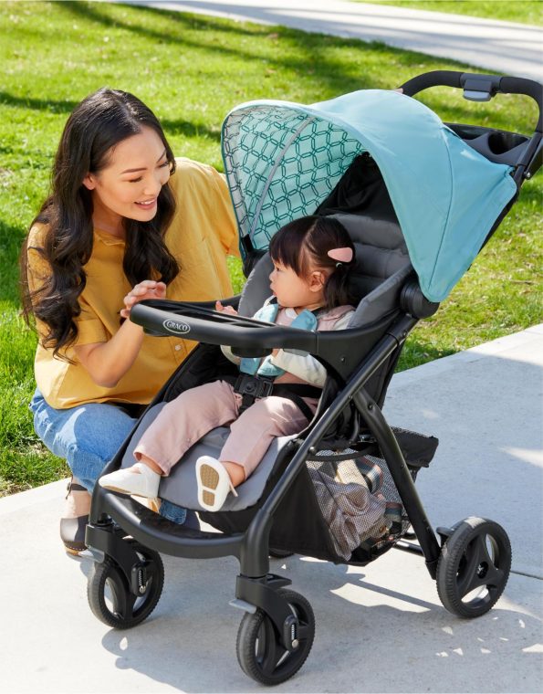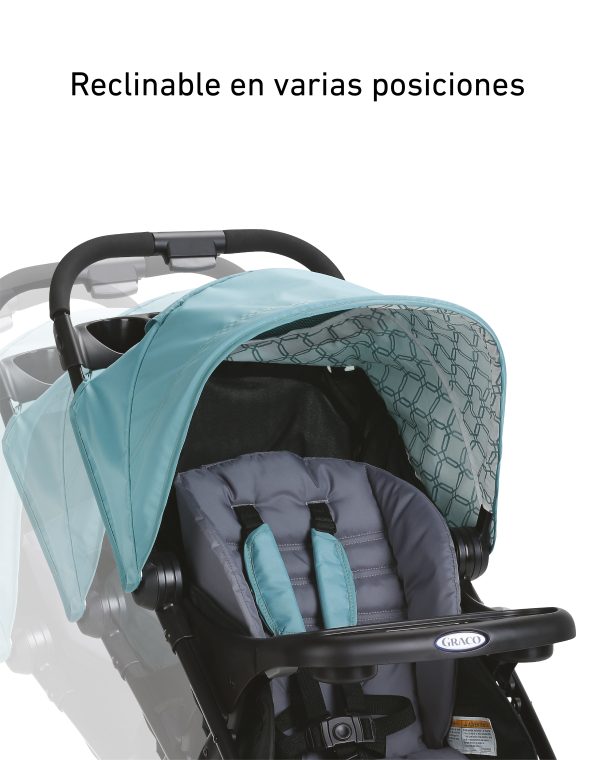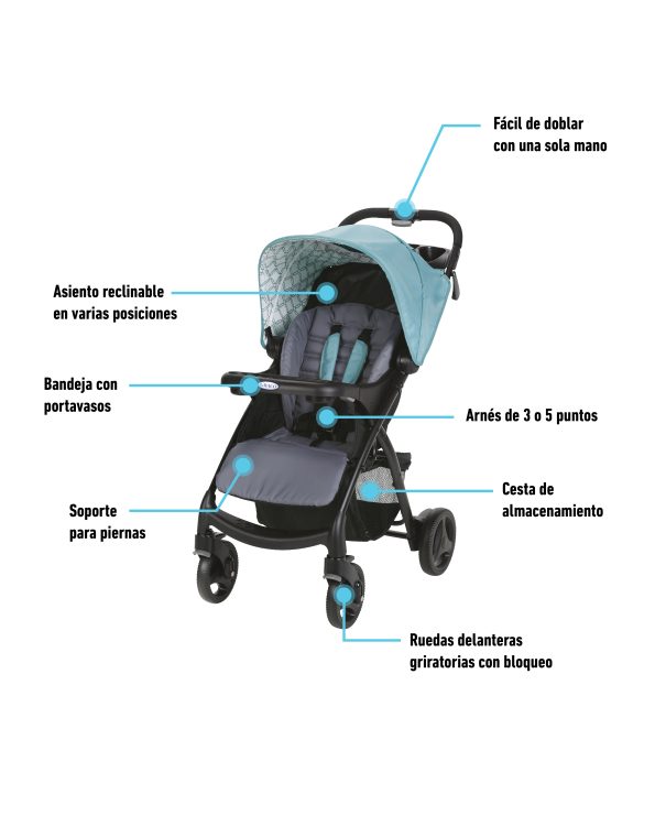 • Bandeja para padres con portavasos y almacenamiento para llevar lo esencial.