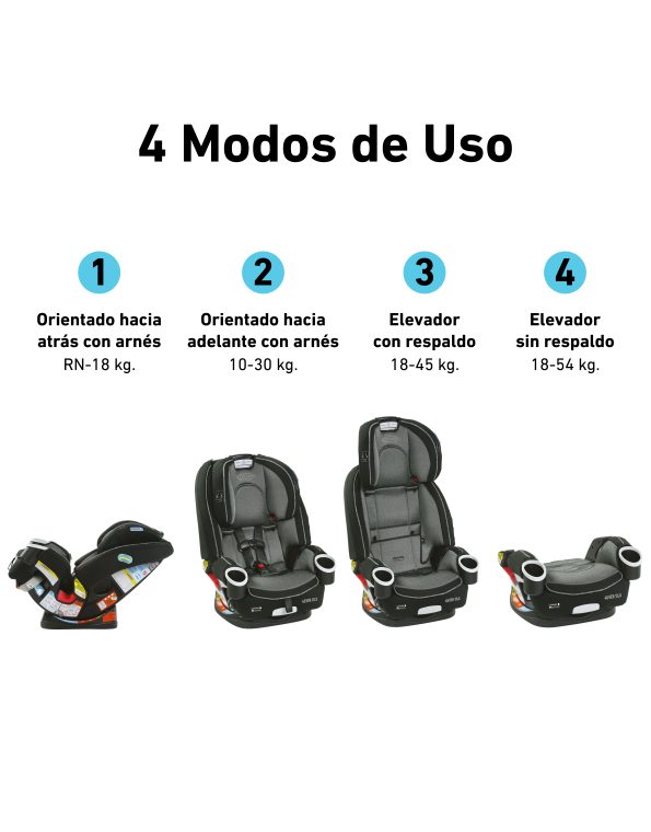 - Crece con el niño en 4 etapas: Etapa 1: orientado hacia atrás con arnés: RN a 18 kg. Etapa 2: hacia adelante con arnés: 10 a 29 kg. Etapa 3: elevador con respaldo: de 18 a 45 Kg. Etapa 4: elevador sin respaldo: de 18 a 54 kg.