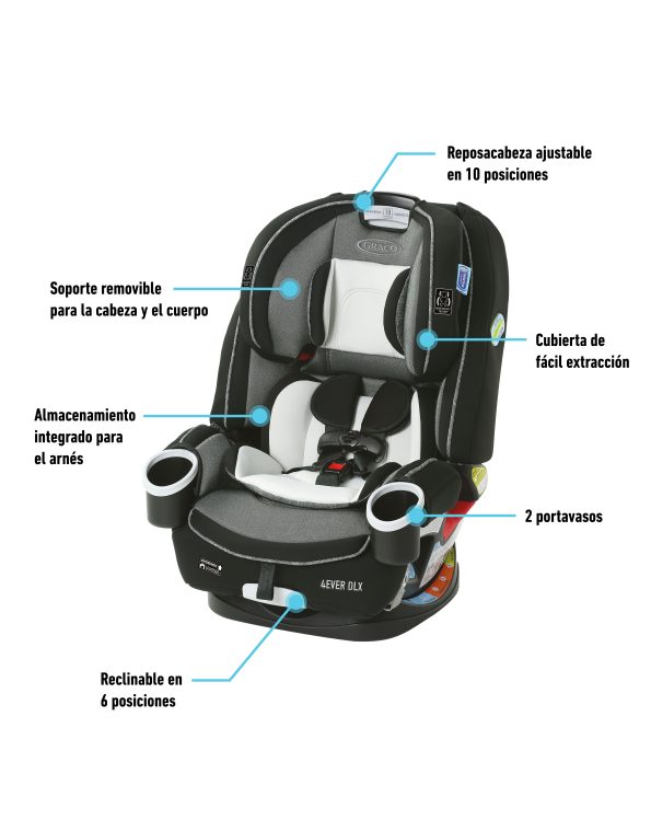 Protegé a tu hijo por 10 años con este asiento 4 en 1. Se transforma de asiento con arnés orientado hacia atrás, a un asiento con arnés orientado hacia adelante. Luego se convierte en un elevador con respaldo y finalmente a un elevador sin respaldo.