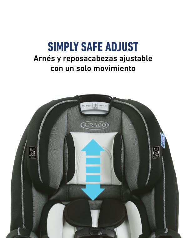 Este asiento cumple y supera las normas de protección ante choques de EE.UU. Tiene tres modos de uso para crecer con tu hijo desde los 10 kg hasta los 54 kg. Cuenta con sistema de arnés Simply Safe Adjust ™, que ajusta el arnés y el reposacabezas fácilmente.